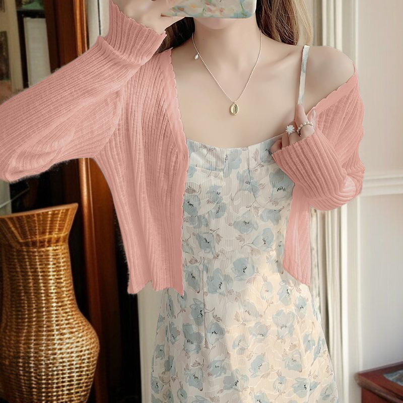 여름 얇은 슬립에 가디건 블라우스 자외선 차단 니트 스커트에 짧은 점퍼를 입는다